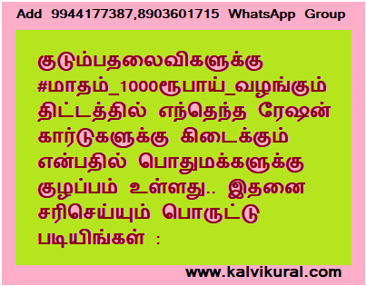குடும்பதலைவிகளுக்கு #மாதம்_1000ரூபாய்_வழங்கும் திட்டத்தில் எந்தெந்த ரேஷன் கார்டுகளுக்கு கிடைக்கும் என்பதில் பொதுமக்களுக்கு குழப்பம் உள்ளது.. இதனை சரிசெய்யும் பொருட்டு படியிங்கள் :